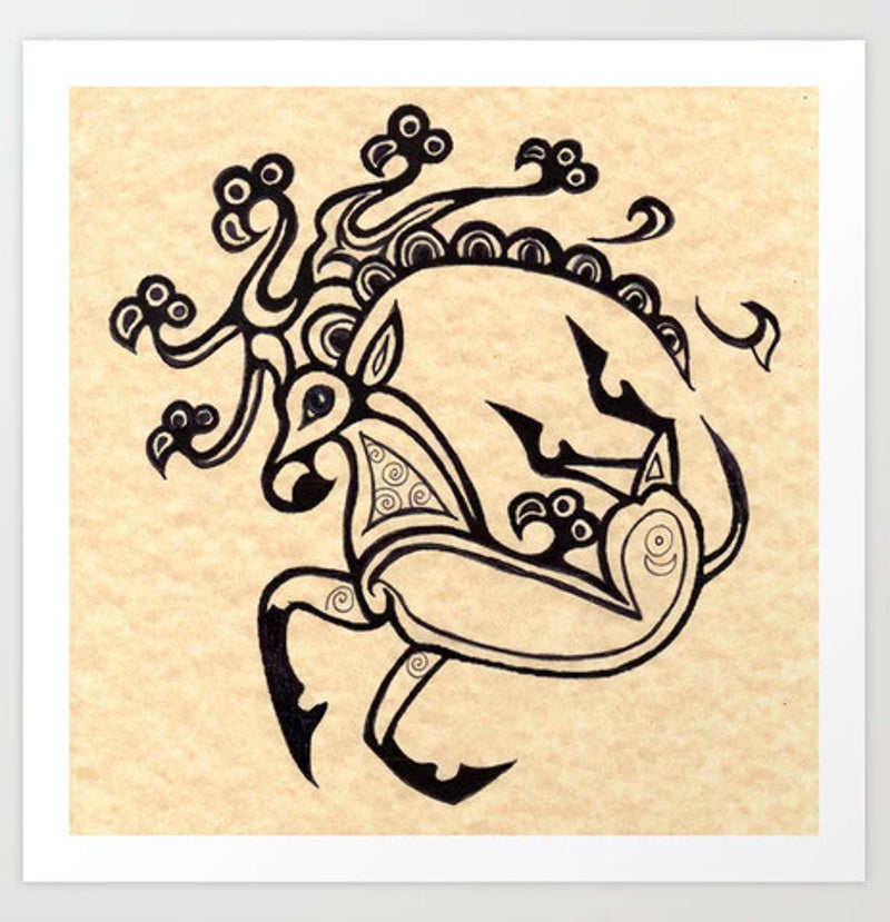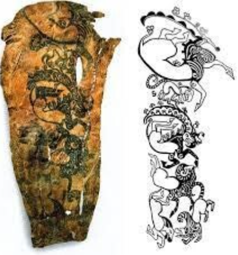 The most interesting aspect about the Scythian culture is the well-known tattooing and even the style of beastly drawings. These drawings often coincide with symbols on armor, goldwork or jewelry. Symbolically, there is no concrete clarity or meaning for each of the drawings. It is assumed that the stag and ram symbolize the monarchy, but the beasts of prey warrior’s cruelty, gryphons life after death. Tattoos could be worn not only by men, but also by women, regardless of their status (there are also a couple of dates that describing that newborns were also tattooed to protect them from evil forces). An interesting fact is that a couple of mummies that archaeologists have found are decorated with tattoos in specific places. This includes the shoulders, arms, legs, chest and neck, but not the head or face. Among the mythological beasts were found winged wolves and winged lions. Unanswered question - Why do tattoos of animals often have their bodies turned to other side ? If you know, please write, I didn't find an explanation!