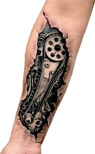 Biomechanical / bioorganic tattoos are a stylistic approach to tattooing that combines the human body with modern designs, making it appear as if the body consists of mechanical parts. In B.B. tattoos, details and realism are important. Only when it is impossible to tell from a short distance whether the tattoo is real, or a mechanical device is the desired tattoo effect achieved.