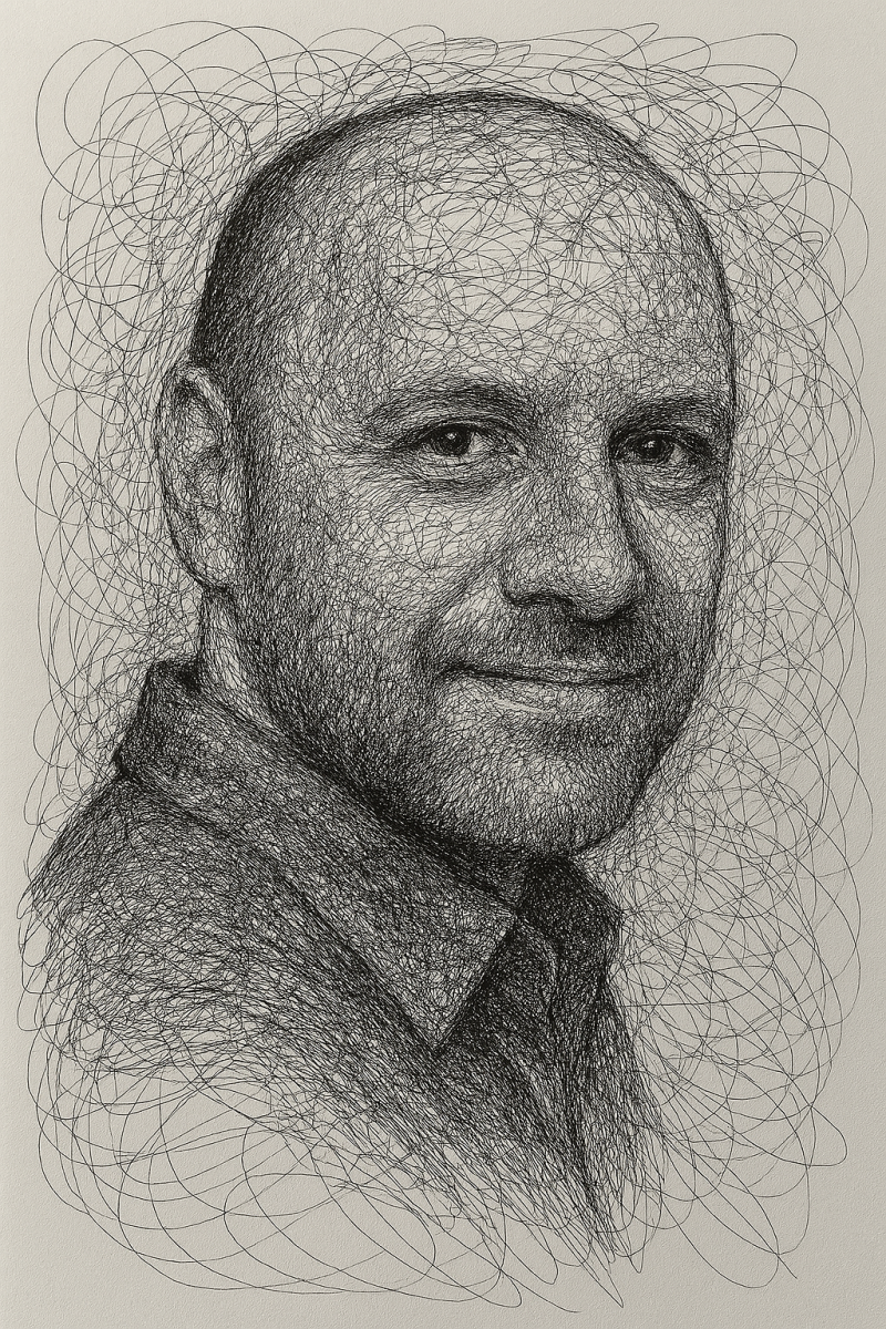 I.n.t.e.r.e.s.t.i.n.g. today’s technologies are developing at the speed of optical‑internet bandwidth, AI is now fully deployed and complements our daily life. It is an indisputable fact that AI has potential; it can evolve and learn, and at times its responses could even astonish a Professor. When we asked our AI about the created images and whether it is able to recognize the person in the original photography from the scribble it produced, the following response code was written "When creating a human portrait, the AI is based on facial points by which it models the portrait visible in the image; the requirement to scribble shifts the main facial control points, and this is a scribbling maximally approximated to the source material" Would you recognize David Cage from this scribble ? “Of course I created this person’s portrait from the original photo.”