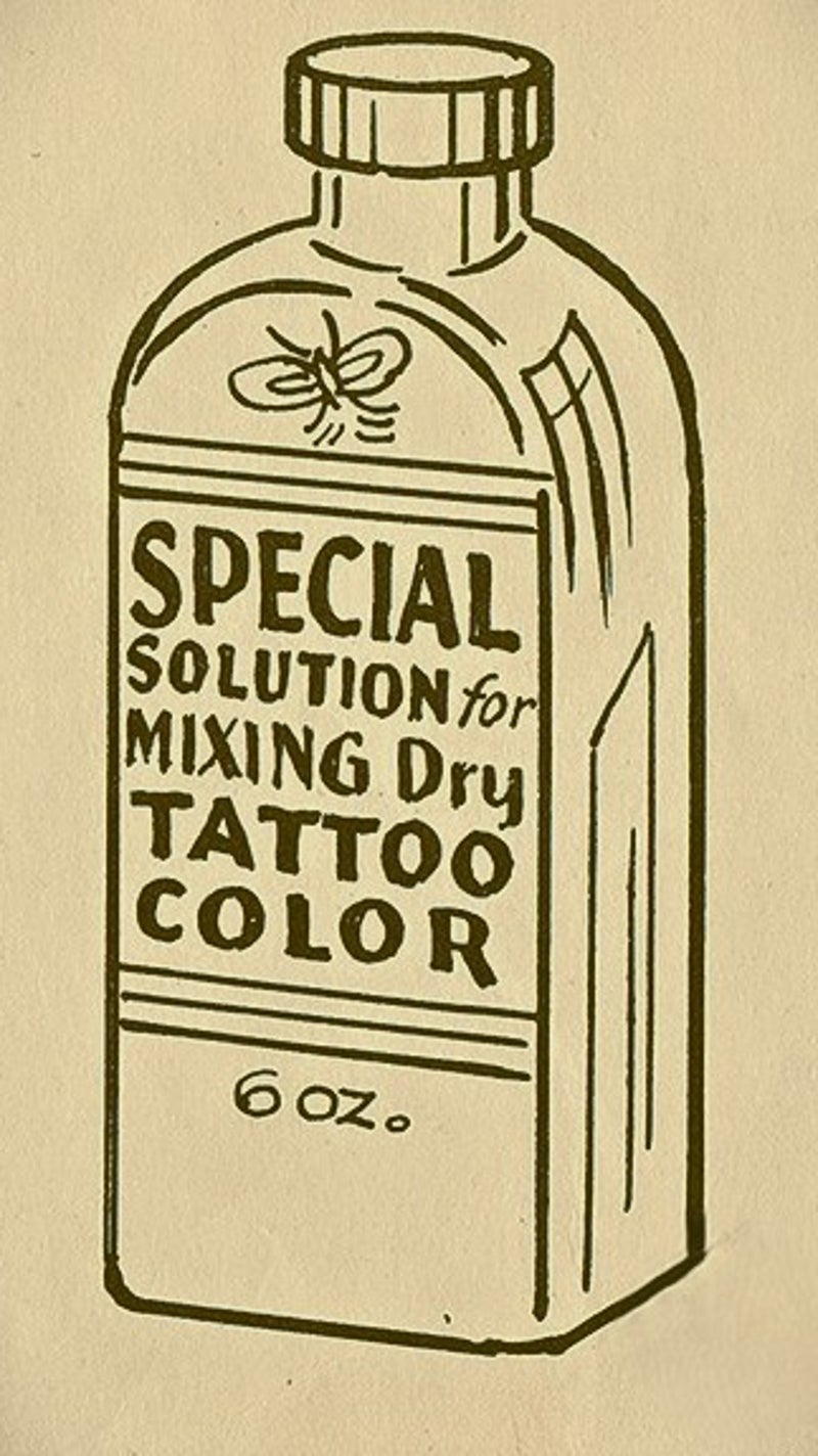 Sailor Jerry, who began working as a tattoo artist in the 1930s, mixed D&C dry color pigments (approved for medical and cosmetic use) with isopropyl alcohol and benzalkonium chloride. He worked with Bob Palm, a tattoo artist who had studied chemistry, to find pigments that would expand his color range, including tattooing himself and testing for bad reactions. He introduced the use of phthalo green ink, and he used a purple pigment that he hid from other artists for many years.