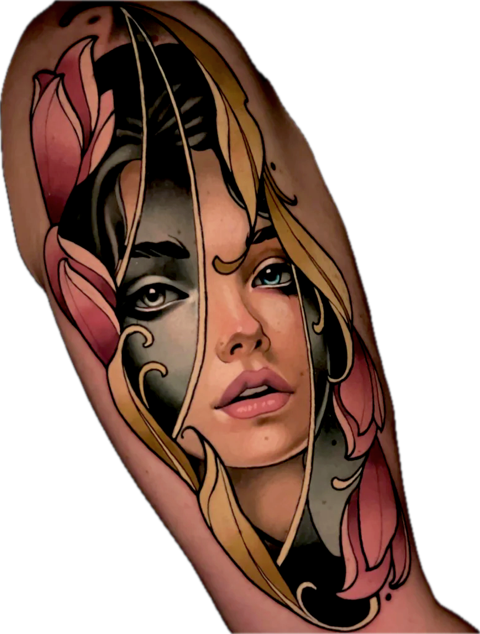 Neotraditional tattoos share many techniques with American traditional tattoos; however, they harness artistic potential to a far greater extent and allow for very diverse designs. The common foundation lies in clear, thick outlines drawn with black ink, and the colors are bold and vivid. In contrast to the flat appearance of American traditional tattoos with their classic color palette, neo-traditional tattoos typically offer a more multidimensional look and an expanded range of colors. Most importantly, the style focuses on density and intricate details that are not as common in American traditional tattoos. This allows neo-traditional designs to encompass a wide range of subjects—from flowers and objects to animals and even full portraits. Unlike other modern tattoo styles, the understated approach and meticulous attention to detail in neo-traditional tattoos impress with refined design, bold coloring, and decorative framing.