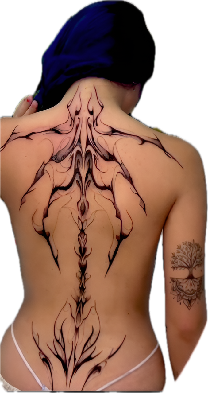 angles, used to create intricate patterns that resemble a mixture of circuitry and organic forms. This references is the opposite of the heavy Tribal lines. Thin, precise lines are a feature of cybertribal, clearly distinguishing it from the stronger tribal tattoos of the past. However, both styles share the feature of being created with black ink, although it is also possible to find colorful designs. The delicate structure of the lines has found resonance and sympathy among the female gender.